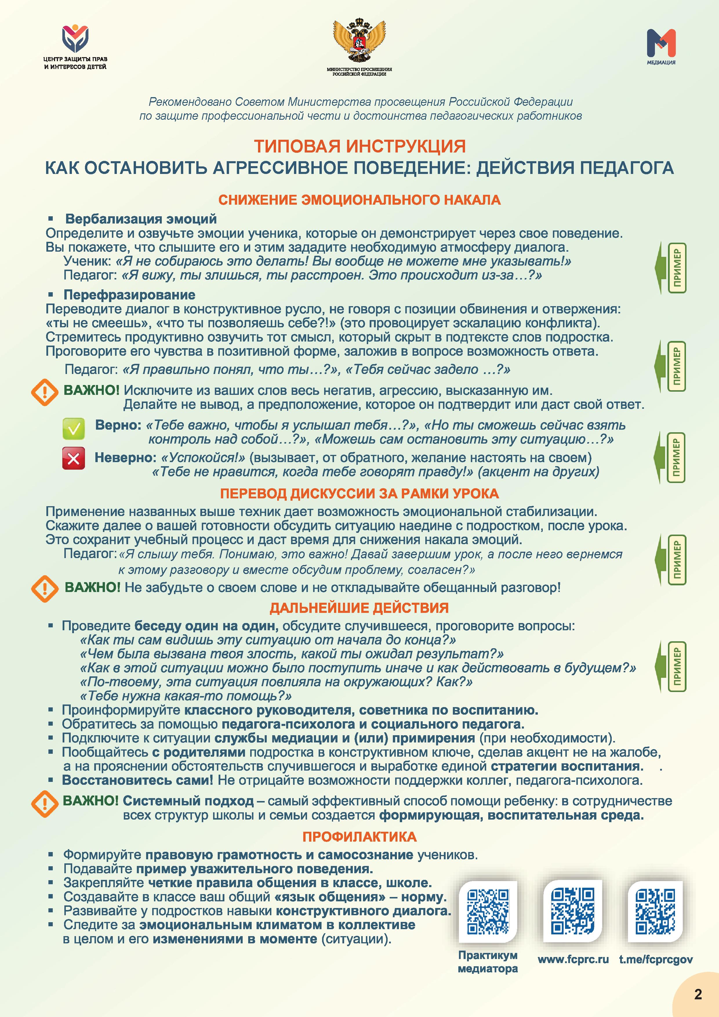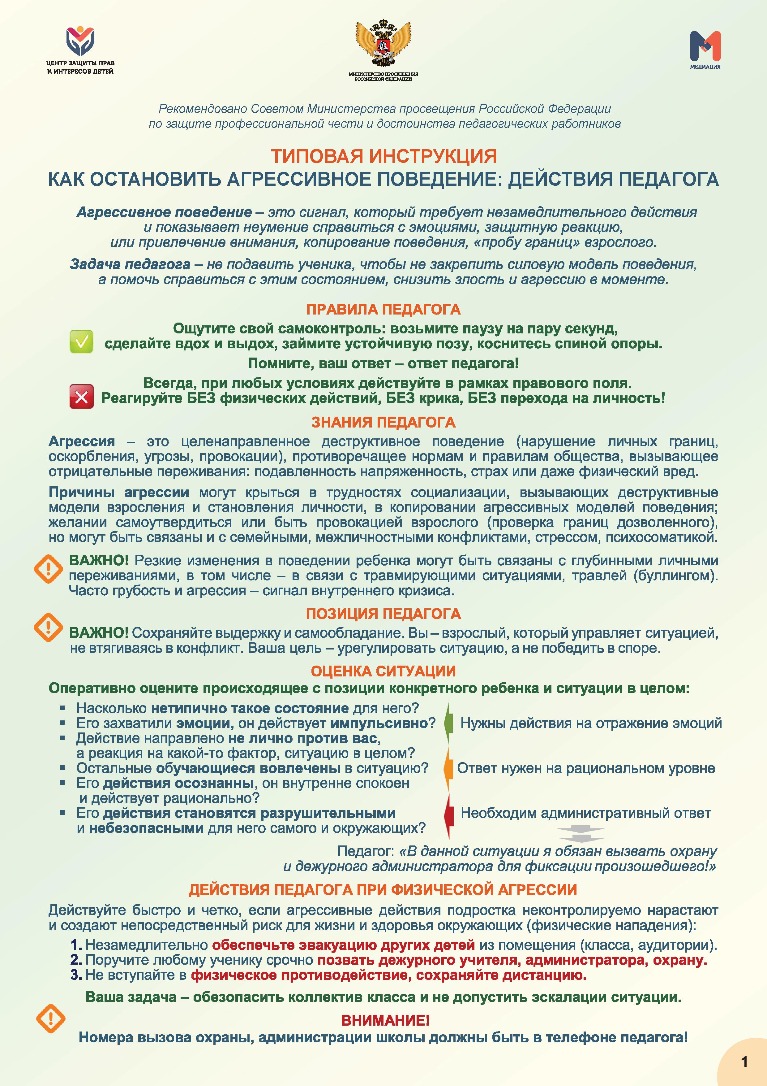 Минпросвещения России в рамках проводимой работы Совета Министерства просвещения Российской Федерации по защите профессиональной чести и достоинства педагогических работников были разработаны и одобрены Советом типовые инструкции в случае возникновения конфликтной ситуации у